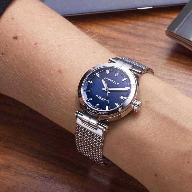 Le fond de cadran est en nacre bleue. Ce cadran rond est d'autant plus précieux que quatre éclats de diamants représentent les index des 6 et 12 heures. Pour avoir une lisibilité complète, un chemin de fer des minutes et dix index luminescents sont installés sur le cadran. De même, les aiguilles des heures et des minutes sont recouvertes d'une matière luminescente. L'aiguille des secondes glisse dans le cadran et chevauche un guichet date près des 3 heures. Herbelin achève sa création de son nom.