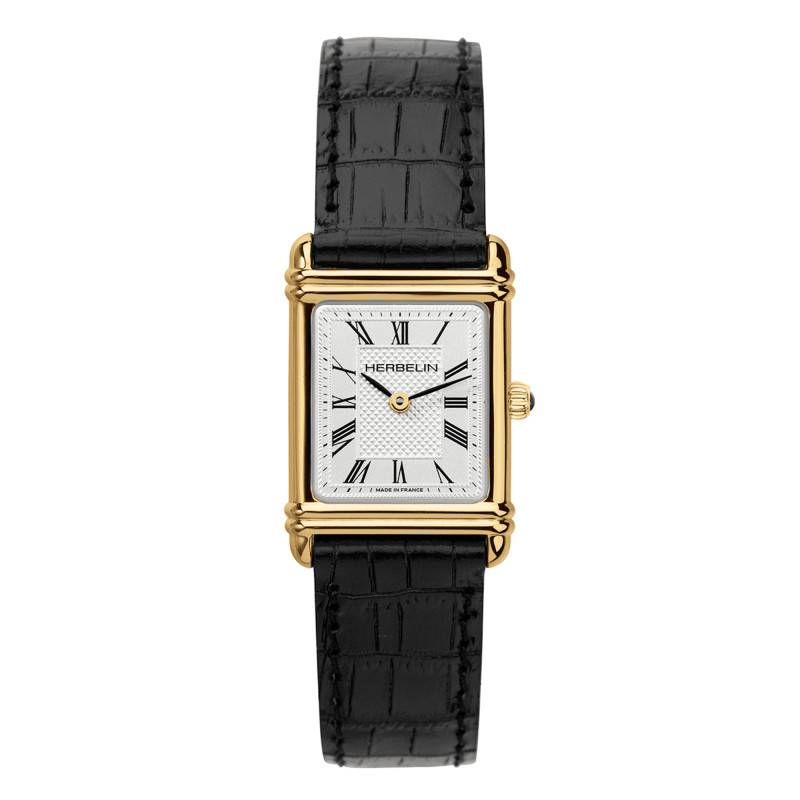 Cette montre élégante et classique possède un boîtier rectangulaire (24.40 mm de longueur, 20.30 mm de largeur et 6.15 mm d'épaisseur) en PVD or. Le cadran blanc accueille deux aiguilles noires (heure et minute), et des index en chiffres romains noirs. Le bracelet est en cuir véritable de couleur noire. Cette montre est résistante à l'eau jusqu'à 5 atmosphères soit 50 mètres.