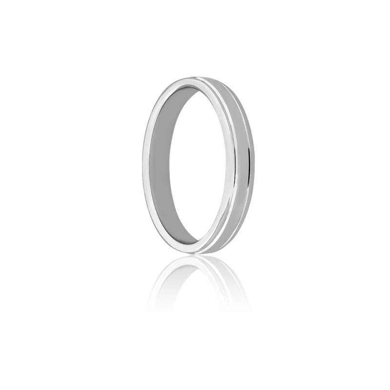 On aime cette élégante alliance pour sa sobriété. Cette alliance dispose a été réalisée en or blanc palladié 750/1000 (18K) et a une finition polie pour scintiller de mille feux. L'alliance est agrémentée de 2 rainures sur les côtés. La bague a une largeur de 3,50 mm et une épaisseur de 1,30 mm. Enfin, comptez un poids d'or moyen de 3,72 grammes.