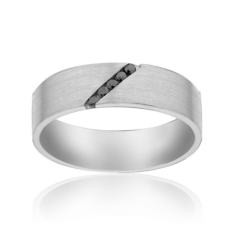 Délicate et originale à la fois, cette alliance d'une largeur de 6 mm se compose de palladium 950/1000 à la finition brossée, ainsi que de cinq diamants noirs sertis par un rail diagonal au centre de l'alliance ayant un poids total de 0,07 carat. Le poids de palladium moyen de la bague est de 5,80 grammes.