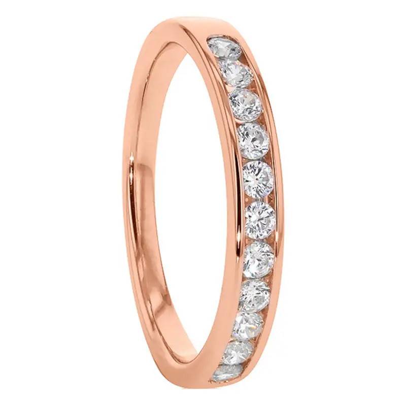 Déclarez votre flamme avec la plus belle pierre qui soit : le diamant. En effet, cette superbe alliance a été réalisée en or rose palladié 750/1000 (18K) et est dotée d'une finition polie. On retrouve onze diamants de taille brillant qui sont sertis rail en or rose sur le demi-tour de l'anneau. Les diamants ont un poids total de 0,30 carat et sont de couleur G et de pureté SI2. La bague a une largeur de 3 mm pour une épaisseur de 1,67 mm. Enfin, comptez un poids d'or moyen de 2,84 grammes.