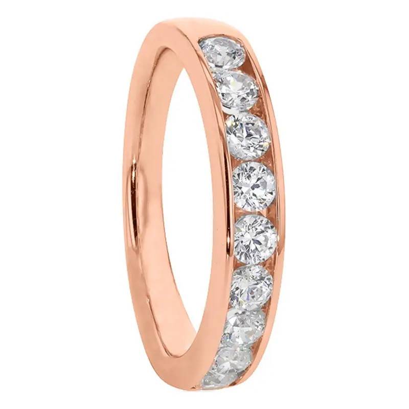 Nous avons choisi rien que pour vous et votre moitié cette superbe alliance réalisée entièrement en or rose palladié 750/1000 (18K) dotée d'une finition polie. Pour la faire scintillier de mille feux, neuf diamants de taille brillant ont été sertis rail en or rose sur le demi-tour de l'anneau. Les diamants ont un poids total de 0,63 carat et sont de couleur G et de pureté SI2. Concernant ses dimensions, l'alliance a une largeur de 3,60 mm pour une épaisseur de 2,13 mm. Enfin, comptez un poids d'or moyen de 3,84 grammes.