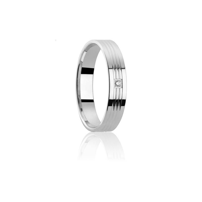 Cette charmante alliance réalisée en or blanc palladié rhodié joue sur le côté tactile. Son extérieur légèrement arrondi est composé d'un ruban aux motifs rainurés, large de 4 mm. Au centre, est serti un diamant de couleur H et de qualité SI1 pour un poids total en carat de 0,01 carat. L'intérieur de l'anneau, quant à lui, est plat. Enfin, comptez un poids d'or moyen de 3,10 grammes.