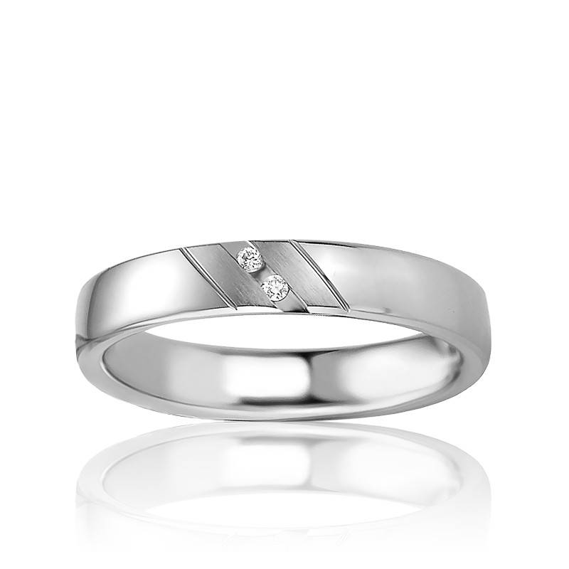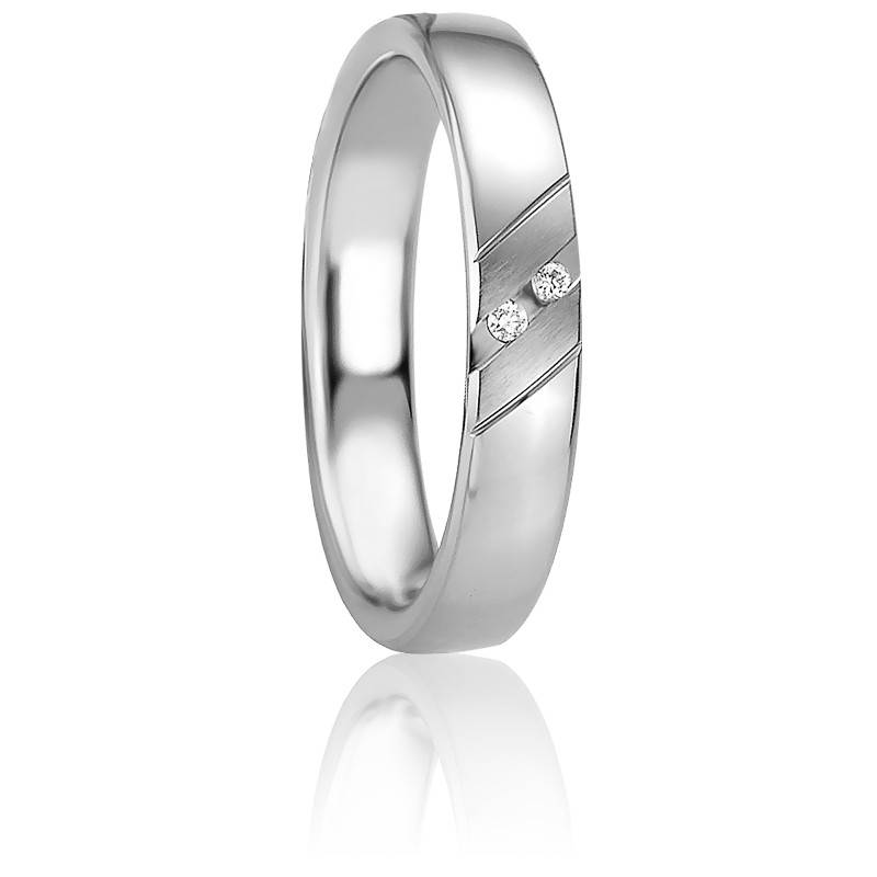 Découvrez cette sublime alliance de forme bombée en argent massif 925/1000 à la finition polie. Un motif composée de bandes latérales à la finition brossée vient orner le centre de la bague. Deux diamants taille brillant sont sertis entre les deux bandes d'argent brossé. Pour un porté agréable, cette alliance possède un intérieur confort. Les diamants sont de couleur H et de pureté SI1. Enfin, comptez un poids moyen de 4,27 grammes pour une largeur de 4 mm.