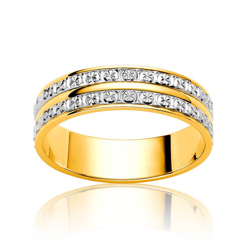 Nous vous dévoilons cette somptueuse alliance pleine de charme. Cette alliance a été réalisée en 2 ors 750/1000 (18K), or jaune et or blanc. Elle dispose d'une largeur de 5 mm et est de forme semi-bombée à la finition polie. Le corps de cette alliance est en or jaune et les deux bandes en or blanc sont lapidées pour créer un effet diamanté. L'effet diamantée apporte tout la différence et donne l'impression d'avoir de véritables diamants. Comptez un poids moyen d'or de 3,76 grammes.