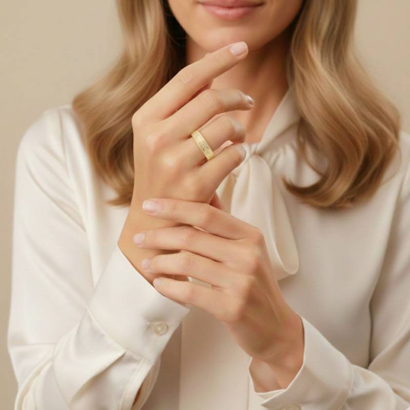 Laissez-vous envoûter par l'élégance sublime de l'Alliance Concave Brossé en Or Jaune 375 et Diamants 0,03 ct. Cette alliance se distingue par sa largeur de 4 ou 5 mm et son épaisseur de 1,35 mm, révélant un équilibre parfait entre délicatesse et audace.
