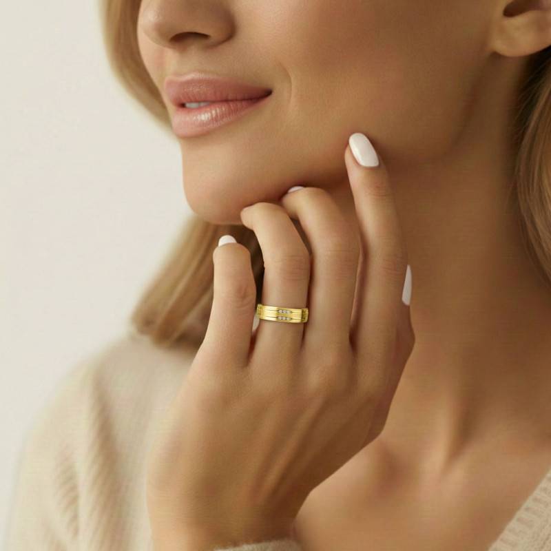 Chaque courbe, finement brossée, révèle la matière noble de l'or jaune 375/1000 (9K), tandis que six diamants éclatants, d'un poids total de 0,03 carat, captivent la lumière dans un serti rail exquis. Ses pierres de couleur G et de pureté SI1 s'accordent avec harmonie pour créer une belle promesse à partager.