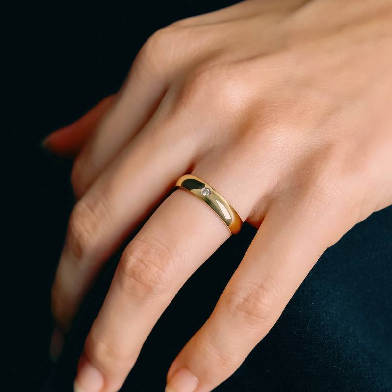 Élégance, modernité et brillance sont au rendez-vous avec cette sublime alliance qui ne laissera personne indifférent. Pensée pour les hommes et les femmes, cette dernière sera la pièce maîtresse de toutes vos apparences et saura symboliser à jamais votre grand amour et votre engagement. Elle est conçue en or jaune 750/1000 (18K) avec une finition polie qui lui accorde un éclat raffiné. D'une largeur de 4 mm et d'une épaisseur de 1,70 mm, cette bague demi-jonc de type confort présente un intérieur plat pour un port confortable. Sa surface bombée est sublimée par un diamant de couleur H et de pureté SI qui est serti masse au centre. Cette pierre blanche de 0,05 carat est taillée dans une forme ronde de 2,30 mm de diamètre et vient donner au bijou un charme sophistiqué. Cette alliance vous est proposée en plusieurs tours de doigt et affiche un poids d'or moyen de 5,05 grammes.