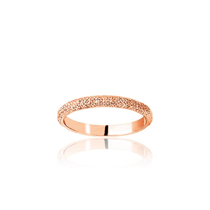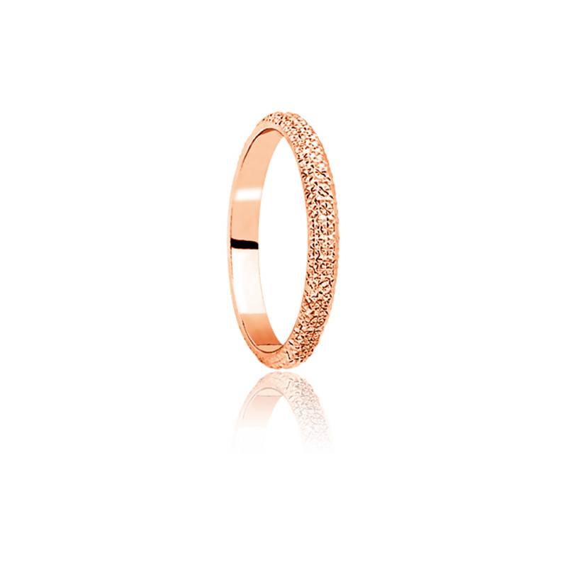 Particulièrement ouvragée, l'alliance Diamantée en or rose 750/1000 (18K) se pare d'un extérieur bombé entièrement lapidé (effet diamanté), l'intérieur est plat. Comptez un poids d'or moyen de 2,80 grammes.