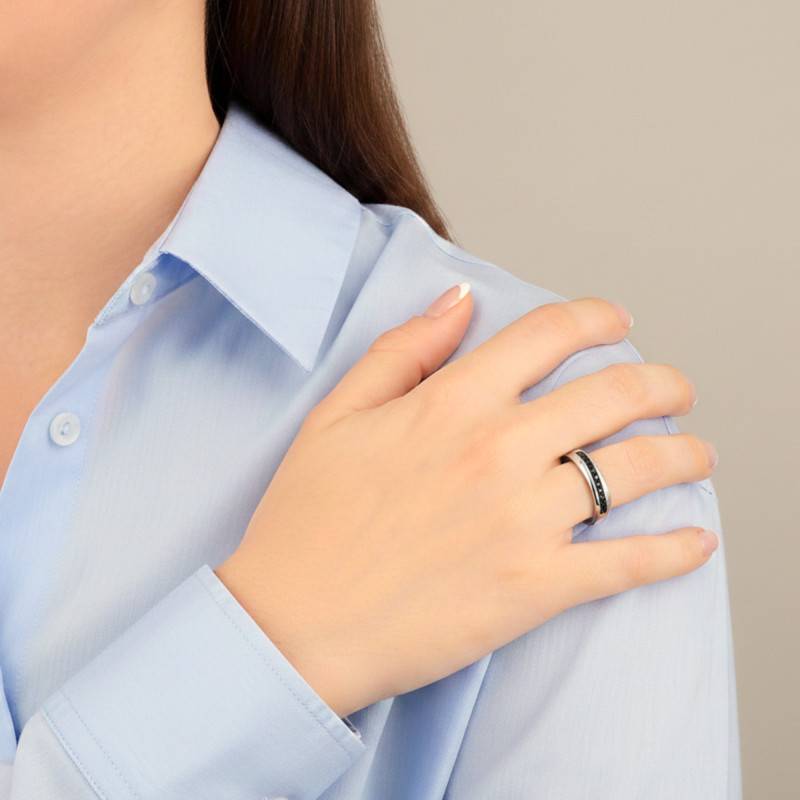 Nous vous invitons à découvrir cette alliance de ton argenté, et travaillée en or blanc 375/1000 (9K) avec une finition polie qui lui accorde cette touche brillante. Elle se forme d'un anneau de 3,60 mm de largeur sur une épaisseur de 0,70 mm. Cette bague se pare d'un pavé de 15 diamants de 0,03 ct et de couleur noire sur une ligne inclinée. Ces précieuses gemmes sont placées sur un placage au rhodium et sont particulièrement éclatantes ce qui vous apportera une note lumineuse. Cette alliance de 1,51 gramme vous offrira une note à la fois raffinée et captivante et complétera toujours vos accessoires. Nous vous proposons cette alliance en taille 54.