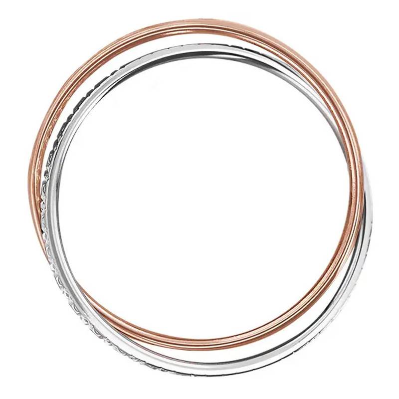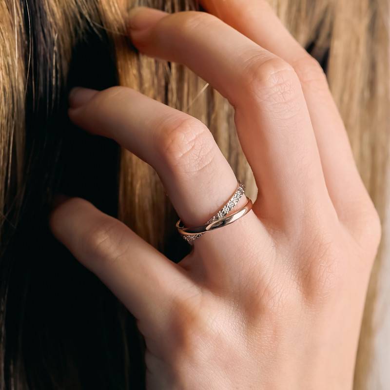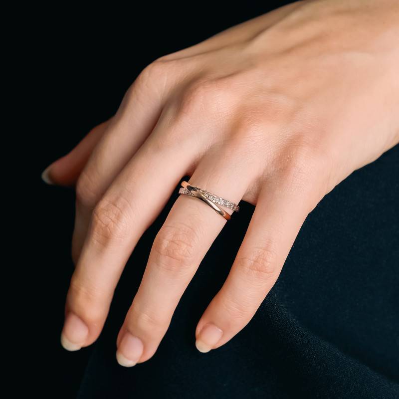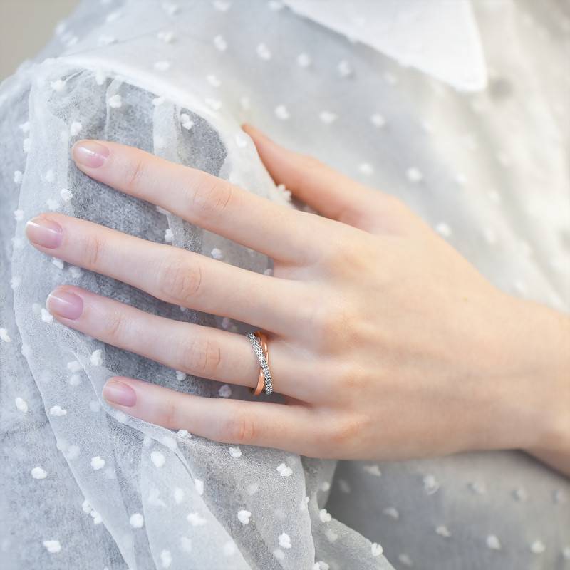 Composée de deux anneaux qui s'entrelacent pour ne former qu'un, cette alliance est bicolore avec un anneau en or rose 750/1000 (18K) et un anneau en or blanc 750/1000 (18K) palladié. Le palladium est un métal que l'on retrouve dans l'or blanc et qui confère à celui-ci un visuel beaucoup plus blanc qu'un rhodiage classique. L'anneau en or blanc possède une finition diamantée qui nous donne l'impression que des diamants sont sertis sur tout l'anneau. L'anneau en or rose quant à lui reste un intemporel avec sa finition polie et brillante qui viendra capter la lumière pour se refléter sur l'effet diamanté.