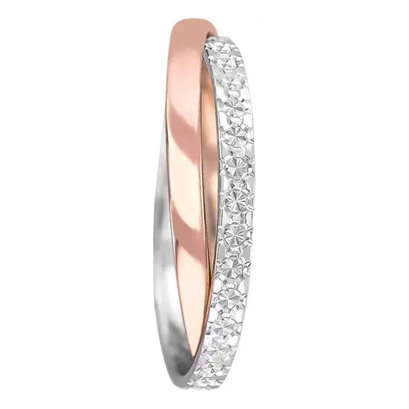 Composée de deux anneaux qui s'entrelacent pour ne former qu'un, cette alliance est bicolore avec un anneau en or rose 750/1000 (18K) et un anneau en or blanc 750/1000 (18K) palladié. Le palladium est un métal que l'on retrouve dans l'or blanc et qui confère à celui-ci un visuel beaucoup plus blanc qu'un rhodiage classique. L'anneau en or blanc possède une finition diamantée qui nous donne l'impression que des diamants sont sertis sur tout l'anneau. L'anneau en or rose quant à lui reste un intemporel avec sa finition polie et brillante qui viendra capter la lumière pour se refléter sur l'effet diamanté.