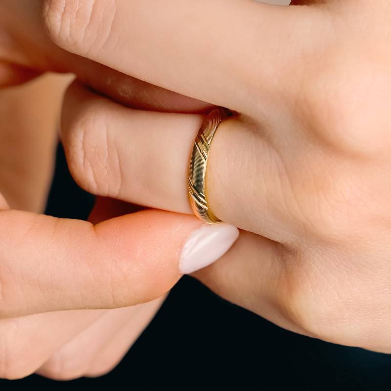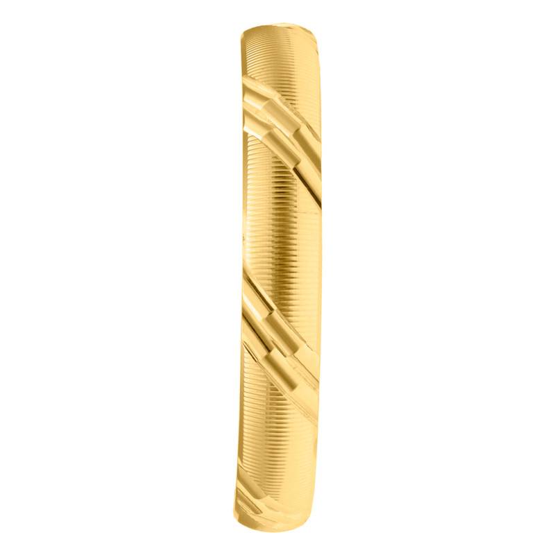 Cette alliance fantaisie matée, de forme ronde, est façonnée en or jaune 750/1000 (18K). Elle se pare d'un anneau qui est relevé par une finition sablée avec des rainures en lignes obliques soigneusement gravées à la surface. Élégante et attrayante, cette bague se combinera avec vos différents accessoires. Elle affiche 3,00 mm de largeur, 1,40 mm d'épaisseur et pèse en moyenne 2,80 grammes. Elle est disponible en plusieurs tailles et son poids varie en fonction de celle-ci. De jour comme de nuit, cette alliance vous accordera une belle allure.