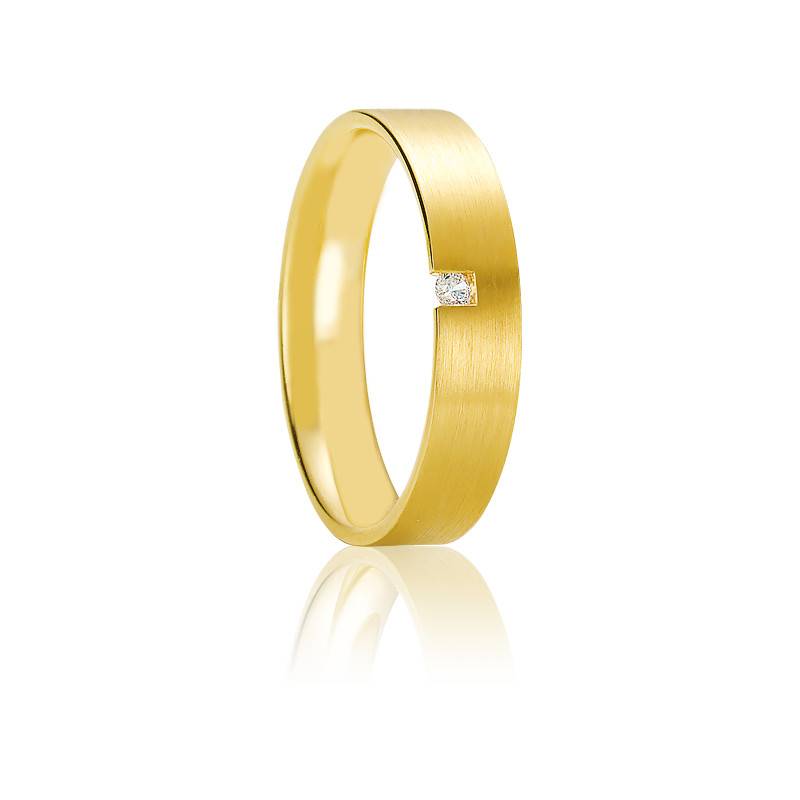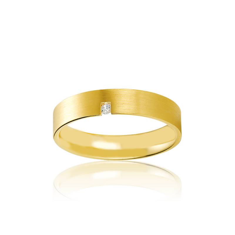 Ocarat vous présente cette ravissante alliance Glyfáda, de forme ruban plat, en or jaune 750/1000 (18K). L'anneau en or jaune à la finition brossée est ajouré au centre sur l'un des bords de l'alliance où un diamant taille brillant de 0,03 carat y est serti rail. Le diamant est de couleur G et de pureté SI1. Comptez un poids d'or moyen de 5,79 g pour une largeur de 4,50 mm et une épaisseur de 1,60 mm.