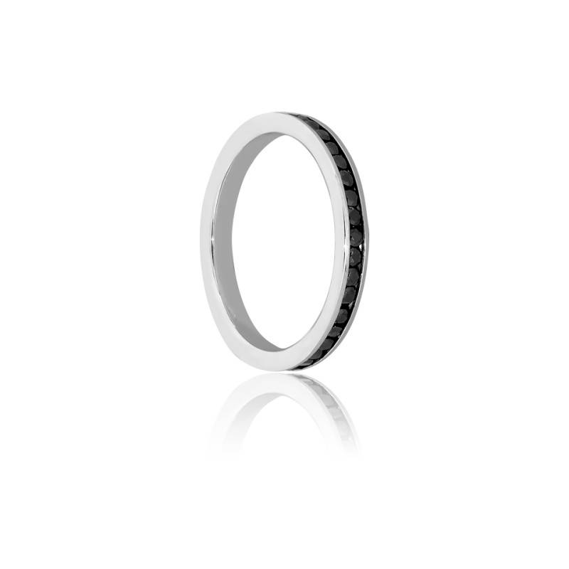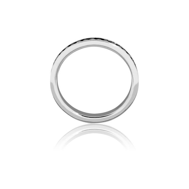 Succombez au charme de cette ravissante alliance Jubba en or blanc palladié 750/1000 (18K). Elle se pare d'une rangée de 47 diamants noirs, sertis rail sur le tour complet. Le poids total des diamants est de 0,611 carat. L'alliance présente une largeur de 2,30 mm pour une épaisseur de 1,80 mm. Comptez un poids d'or moyen de 2,00 g.