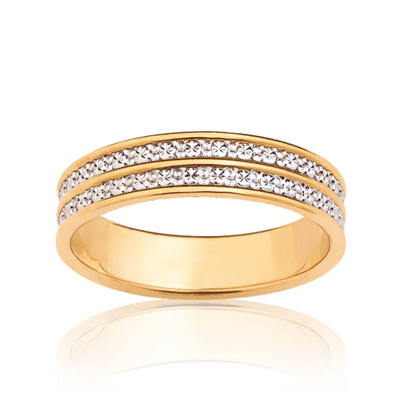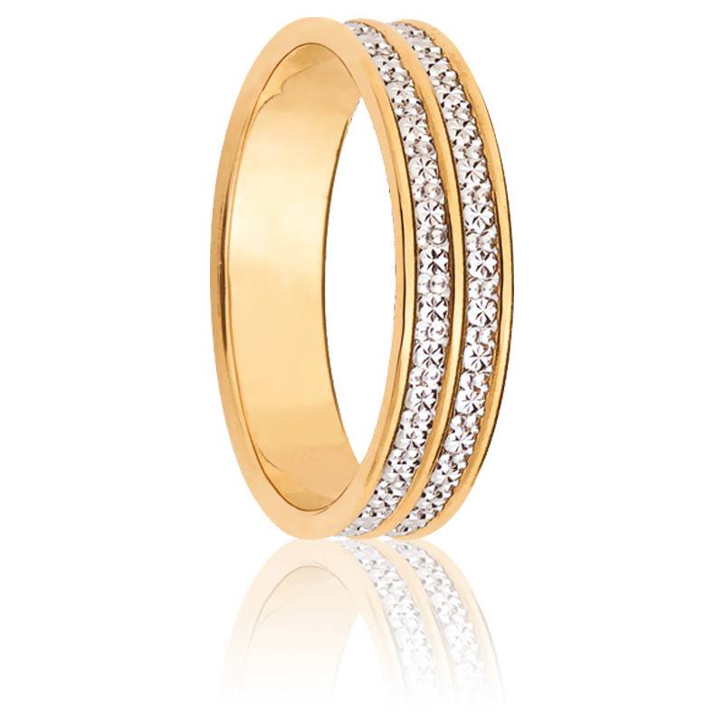 L'anneau en or jaune possède une finition polie pour une brillance incomparable et durable. Formée de deux tours en or blanc facetté, ceux-ci donnent un impression de diamants sertis pour un rendu chic et discret. Cette sublime bague de mariage est disponible pour des tours de doigt allant du 47 au 62. La largeur de cette alliance est de 3,50 mm pour un poids d'or moyen de 2,27 grammes.