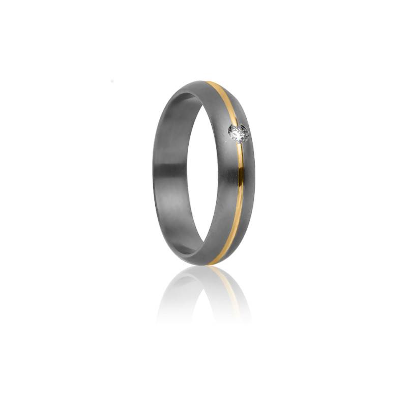 Laissez-vous séduire par le charme de cette alliance. La sublime bague dévoile un ruban satiné en titanium traversé par un liseré central en or jaune 750/1000 (18K). Un diamant de 0,02 carat de couleur H et pureté SI parfait. La finition satinée de cette alliance finit de souligner toute son d'élégance. De 4 mm de largeur, le poids d'or moyen de cette alliance est de 0,72 gramme. L'évidence par la simplicité, qui plaira pour son mélange de couleurs et de matières.