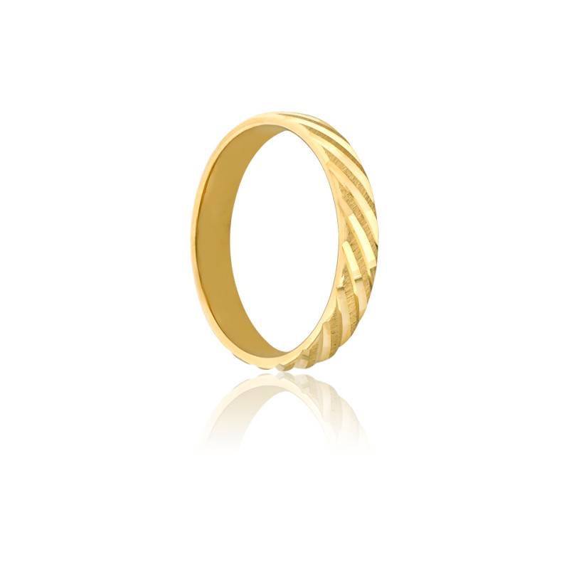 Laissez-vous tenter par cette sublime alliance en or jaune 375/1000 (9K) à la finition givrée. Le corps de la bague est entièrement rayé et l'intérieur est plat. L'anneau présente une largeur de 4,00 mm pour une épaisseur de 1,50 mm. Comptez un poids d'or moyen de 3,77 g.