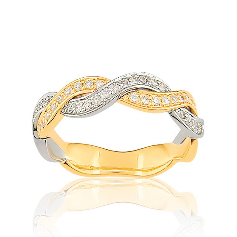 Elégante alliance en or blanc et or jaune rhodié 750/1000 (18K). L'alliance en or jaune se divise en deux vagues or jaune et or blanc entrelacées sur un demi-tour. Les deux vagues sont serties de 39 diamants taille brillants sertis grains pour un poids total de 0,23 carat. Les diamants sont de couleur H et de pureté P1. Un poids d'or moyen de 4,33 grammes pour une largeur de 5 mm.