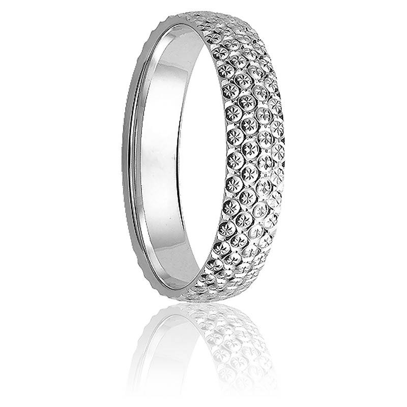Magnifique alliance de la maison Girard, celle-ci est conçue en or blanc 750/1000 (18K) et intègre un motifs baroque sur son extérieur. Le motif bénéficie d'un effet diamanté pour une élégance exacerbée. Ce modèle Sancya est à la fois contemporain, original et terriblement poétique.