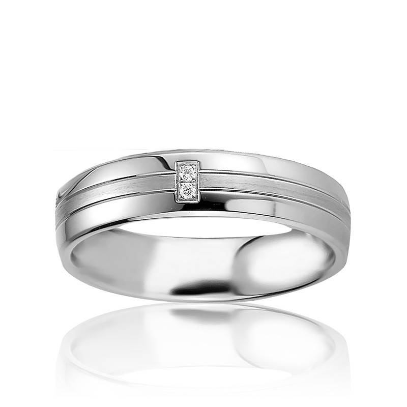 Nous avons le plaisir de vous dévoiler cette élégante alliance réalisée entièrement en argent. Ce modèle de 5 mm de large possède une bande centrale à la finition brossée et des bords extérieurs à la finition polie. On trouve serti deux diamants taille brillant qui sont sertis verticalement au centre de l'anneau pour un poids total de 0,015 carat. Les diamants sont de couleur H et de pureté SI1. La forme bombée de l'alliance vous apporter un confort au porté. Comptez un poids moyen de 4,55 grammes. Sachez que la marque Breuning grave son logo à l'intérieur de chaque alliance "FB ♡".