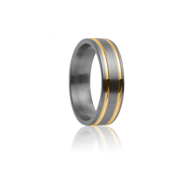 Cette alliance que nous allons vous présenter dispose d'une largeur de 5,50 mm. Elle nous dévoile un délicat ruban satiné réalisé en titanium traversé par deux jolis liserés transversaux en or jaune 750/1000 (18K). Le mélange de ces deux matières nobles rend cette alliance unique et design, parfaite pour offrir à votre moitié. Elle a une épaisseur de 1,50 mm. Concernant ses finitions, l'alliance a une finition brossée et satinée et une finition rainurée. Enfin, comptez un poids d'or moyen de 1,45 g pour ce bijou. Cette alliance existe également en largeur 7 mm.