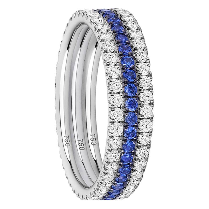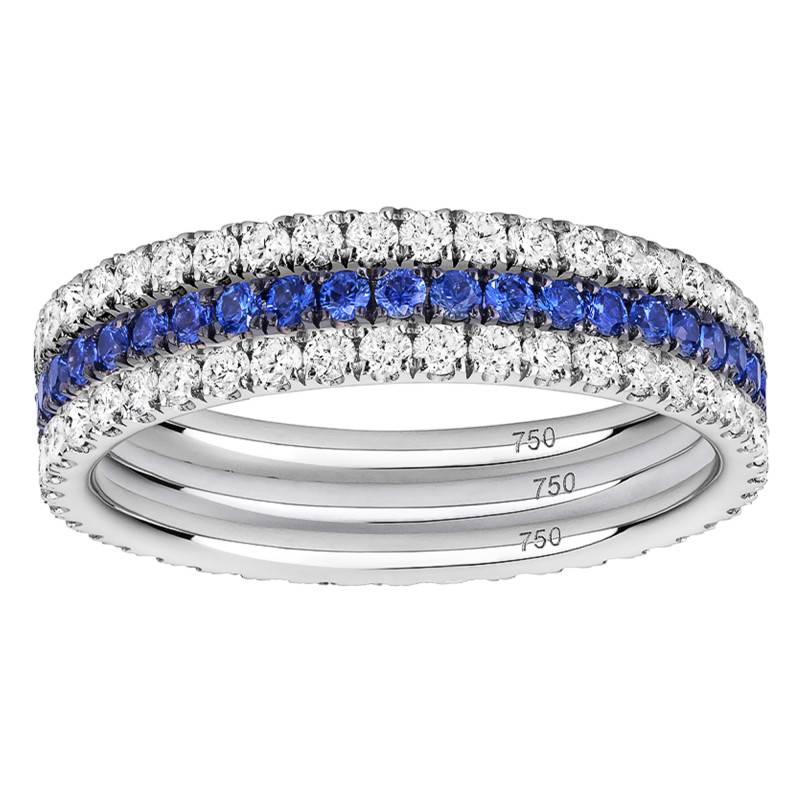 Craquez sans plus attendre pour cette élégante alliance formée par 3 anneaux distincts réalisés en or blanc 750/1000 (18K). Vous pouvez porter chaque anneau séparément ou ensemble comme sur le visuel proposé. Il y a deux anneaux sertis de diamants H/SI et l'anneau central est serti de saphirs bleus d'une couleur exquise. Les pierres sont serties quatre griffes.