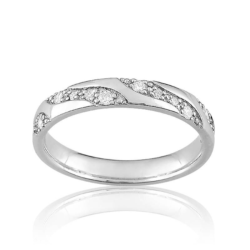 Succombez à cette magnifique alliance contemporaine en or blanc rhodié 750/1000 (18K) à la finition polie. L'anneau est serti de 14 diamants taille brillants sur un demi-tour pour un poids total de 0,18 carat. Les diamants de ce bijou sont de couleur H et de pureté P1. Le poids d'or moyen est de 3,50 g.