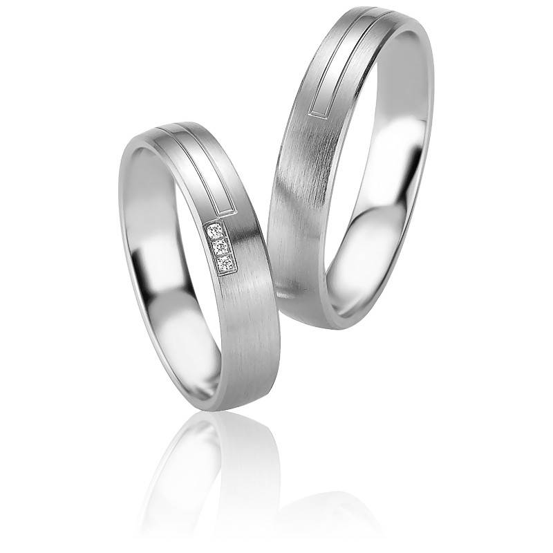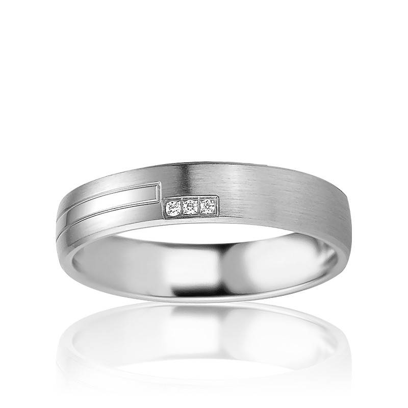 Superbe alliance de forme légèrement bombée en argent massif 925/1000. Une partie de l'alliance possède de fines bandes en argent poli. Le reste de l'anneau possède une fiinition brossée. Une rangée de trois diamants taille brillant sont sertis sur le bord de l'anneau pour un poids total de 0,017 carat. Pour un porté agréable, cette alliance possède un intérieur confort.