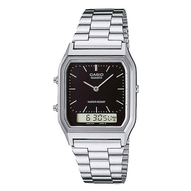 Cette version présente un bracelet en acier argenté et un boitier en résine à fond noir. Le cadran est noir et comporte deux aiguilles indiquant les heures et minutes. Elle possède les fonctions deuxième fuseau horaire avec affichage à cristaux liquides, alarme, chronomètre au 1/100e de seconde et calendrier automatique.
