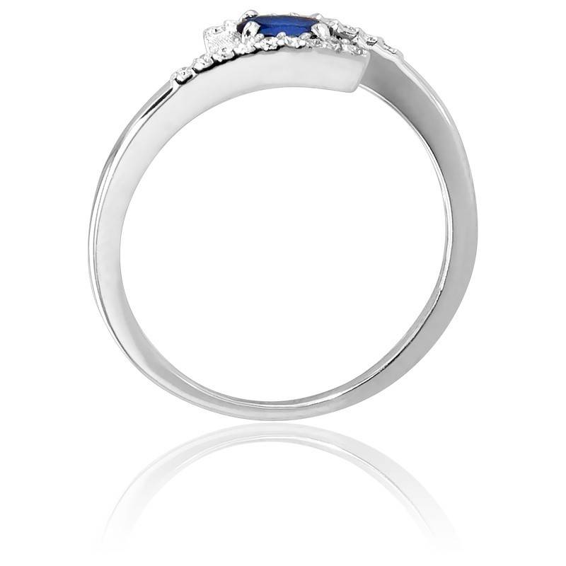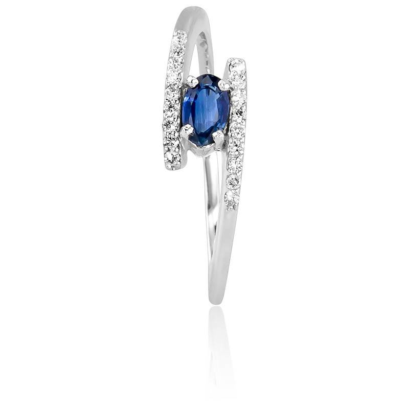 Laissez-vous séduire par cette bague en or blanc 750/1000 (18K) ornée de dix-huit diamants pour un poids total de 0,09 carat. La tête de bague aux dimensions 12,70 x 5,60 mm dévoile en son centre, un imposant saphir 5 x 3 mm taille cabochon serti quatre griffes et de 0,35 carat.
