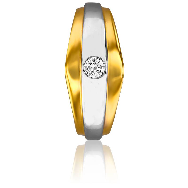 Son aspect princier est mis en avant par un sublime diamant blanc de couleur H et de pureté SI1. Serti clos, le diamant restera sécurisé lorsque vous porterez cette bague. La bande central est en or blanc et les deux autres bandes en or jaune. La largeur de l'anneau est de 3 mm et le poids d'or moyen est de 7,47 grammes.