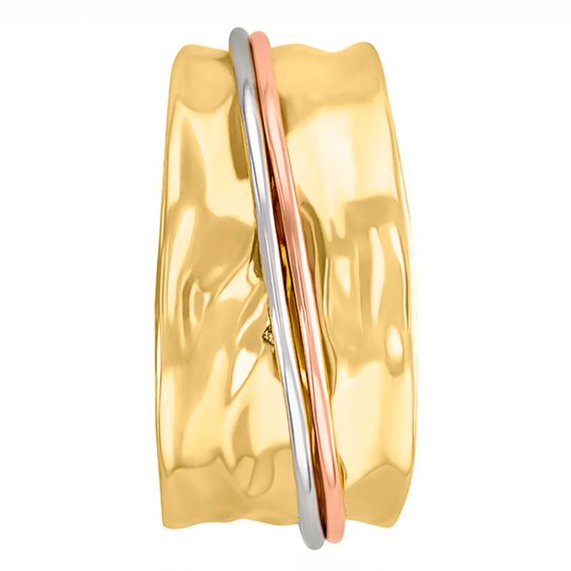 La bague est en Or jaune 375/1000 (9K) et 2 fils d'or blanc et rose y sont mêlés. Son poids d'Or moyen est de 2,65g. Notez qu'elle mesure 11,00 mm de largeur.