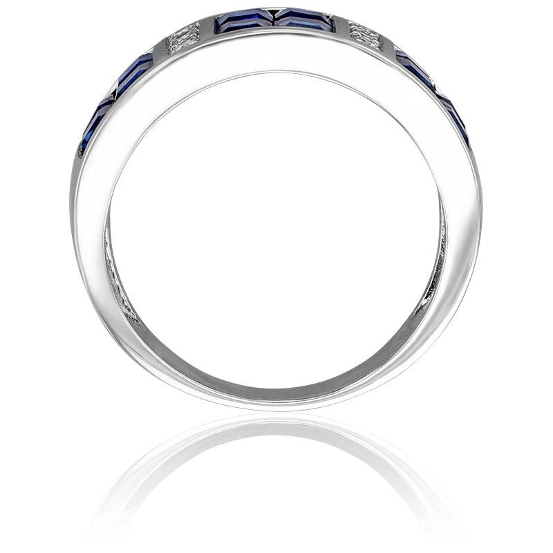 Les saphirs sont entourés d'un pavage de 6 diamants de taille brillant d'un poids total de 0,09 carat, de couleur H et de pureté SI1. Les diamants encadrent merveilleusement les saphirs bleus faisant de cet anneau, une oeuvre plus divine qu'humaine. La tête de bague a une largeur de 7,30 mm. Enfin, le poids d'or moyen est de 4 grammes.
