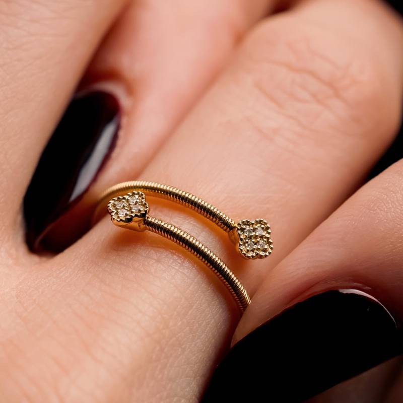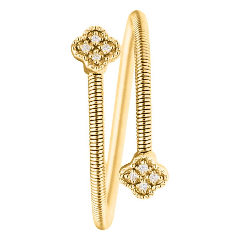 La Bague Trèfle & Diamants 0,02ct en Or Jaune 375 rend hommage à la délicatesse de la nature. Réalisée en or 375/1000 (9K), elle dévoile une teinte jaune lumineuse et une finition polie et brillante. Son motif floral est souligné par 8 diamants blancs totalisant 0,02 carat. Fine et légère, elle présente une épaisseur de 1,30 mm pour un poids de 1,24 g, offrant un port confortable au quotidien.