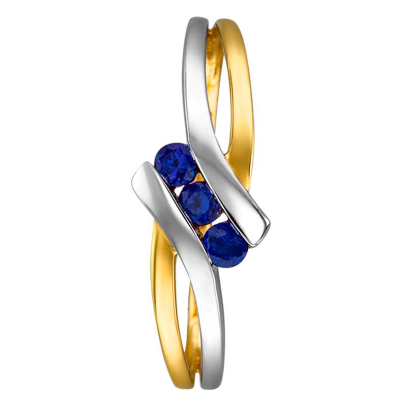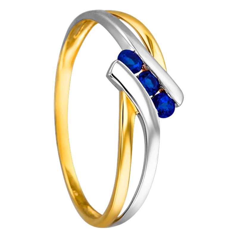 Nous sommes ravis de vous présenter cette bague fine et délicate réalisée en 2 ors 750/1000 (18K). Cette bague est composée de trois saphirs centraux de 0,213 carat, taille brillant et sertis semi-clos. Ceux-ci sont enserrés au milieu de deux anneaux entrelacés en or jaune et en or blanc 750/1000 (18K). La bague, d'une largeur de 7 mm, viendra sublimer votre main et apporter luminosité à vos tenues.