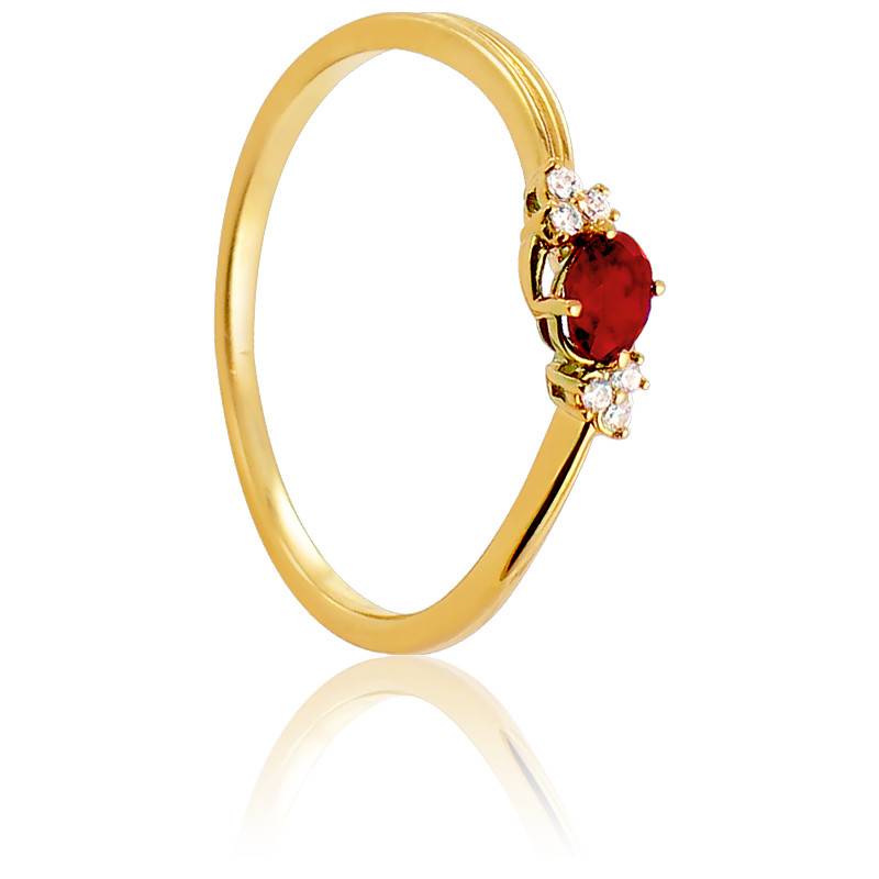 Faites plaisir à votre moitié avec cette superbe bague en or jaune rhodié 750/1000 (18K) à la finition polie. Cette bague est ornée d'un rubis central taille ovale de 0.25 carat agrémentée de diamants taille brillant de 0.03 carat de chaque côté.