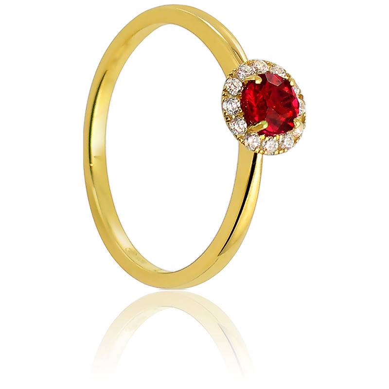 Vous ne résisterez pas au charme et a l'élégance de cette bague rubis et diamant. Cette magnifique bague en or jaune rhodié 750/1000 (18K) possède une finition polie. De forme ronde, cette bague est ornée d'un rubis central taille brillant de 0.36 carat, entouré d'un pavage de diamants taille brillant de 0.10 carat.
