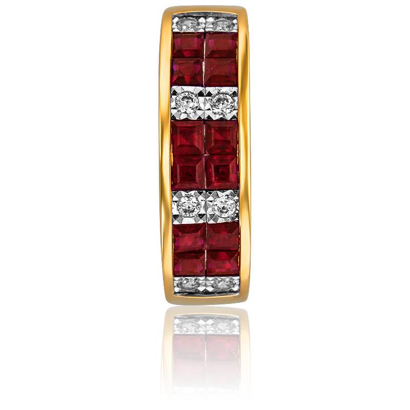 Magnifique bague en or jaune 750/1000 (18K) composée en alternance de douze rubis taille princesse sertis invisibles et de 8 diamants taille brillant sertis grains à découvrir de toute urgence !