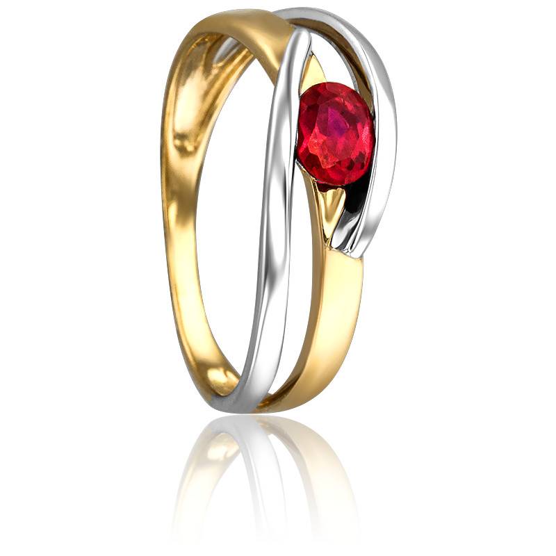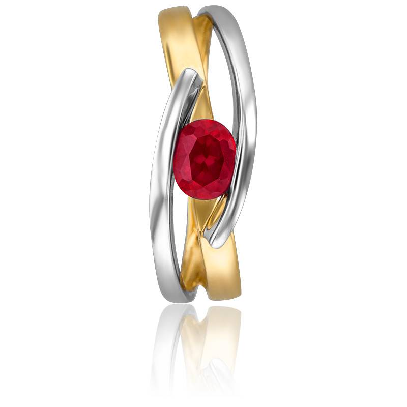 Faites plaisir avec un bijoux précieux unique et tendance. Cette bague 2 ors est le modèle parfait pour habiller vos tenues d'un style moderne chic. Fine et délicate, elle arbore des formes géométriques. Afin d'apporter couleur et éclat au bijou, elle est sertie d'un rubis central de 0,47 carat, de taille ovale et serti semi-clos. Celui-ci est enserré au milieu de deux anneaux entrelacés en or jaune et en or blanc 750/1000 (18K). La bague a une largeur de 6 mm pour un poids d'or moyen de 2,40 grammes.