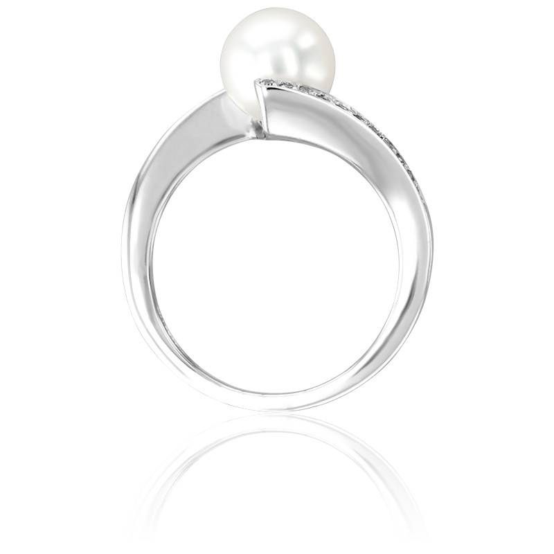 La perle d'eau douce blanche a un diamètre de 8 mm. Telle en apesanteur, cette perle est enchâssée dans l'écartement de la monture pavée de diamants brillants sertis clos. L'anneau a une largeur de 1,50 mm pour une épaisseur de 8 mm au niveau de la tête de bague. Les diamants de couleur H et de pureté SI1, ont un poids total de 0,14 carat. Enfin, le poids d'or moyen est de 4,40 grammes.
