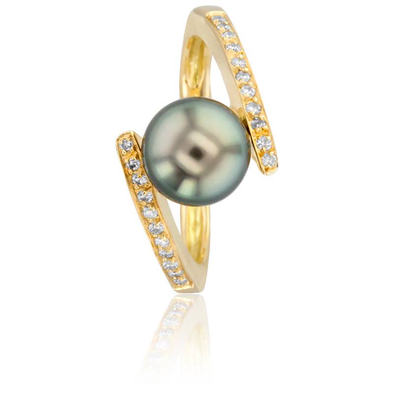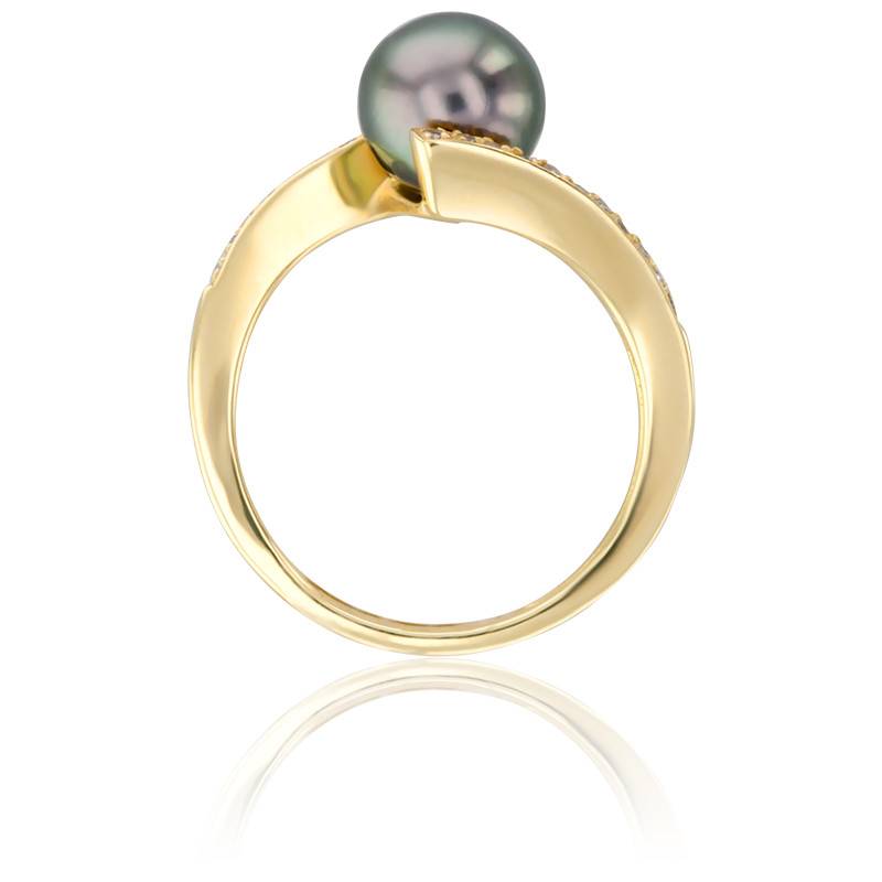 Magnifique et délicate, cette sublime bague en or jaune 750/1000 (18K) apportera une touche d'élégance à vos tenues. Cette perle de Tahiti a un diamètre de 7,50 à 8 mm. Les diamants sont sertis semi-clos laissant une perle de Tahiti en apesanteur enchâssée dans l'écartement de la monture pavée de diamants. Les diamants ont un poids total de 0,14 carat, une pureté H et une couleur SI1. L'anneau a une largeur de 1,50 mm pour une hauteur de 8 mm au niveau de la tête de bague. Les dimensions du motif central sont de 10 mm.