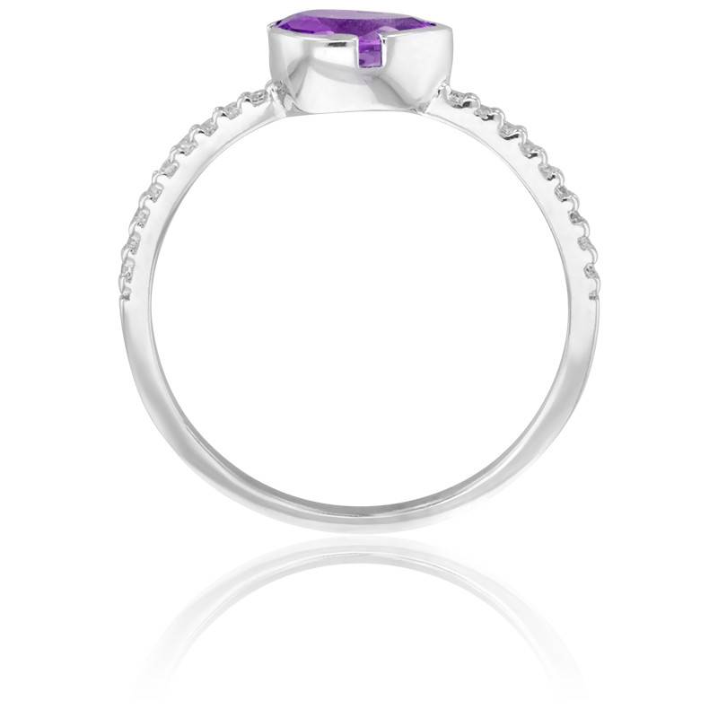 Optez pour cette ravissante bague en or blanc rhodié de la collection Cléo de chez Aurora. Ce petit bijou se compose d'une améthyste taillée en poire et sertie semi-clos de 7 millimètres par 5 ainsi que de dix-huit diamants taillées en brillant.