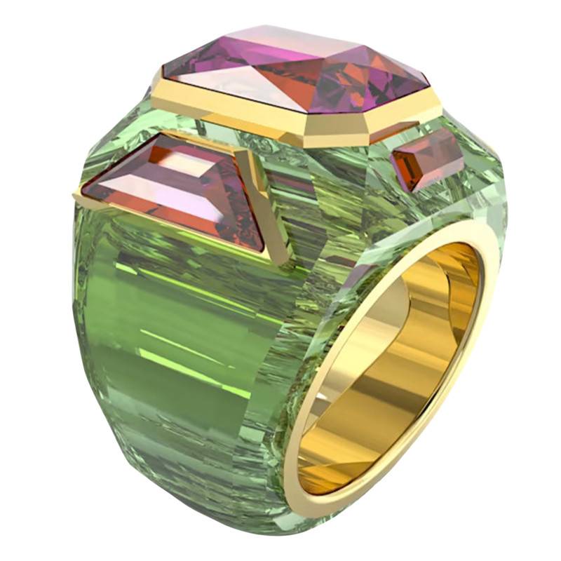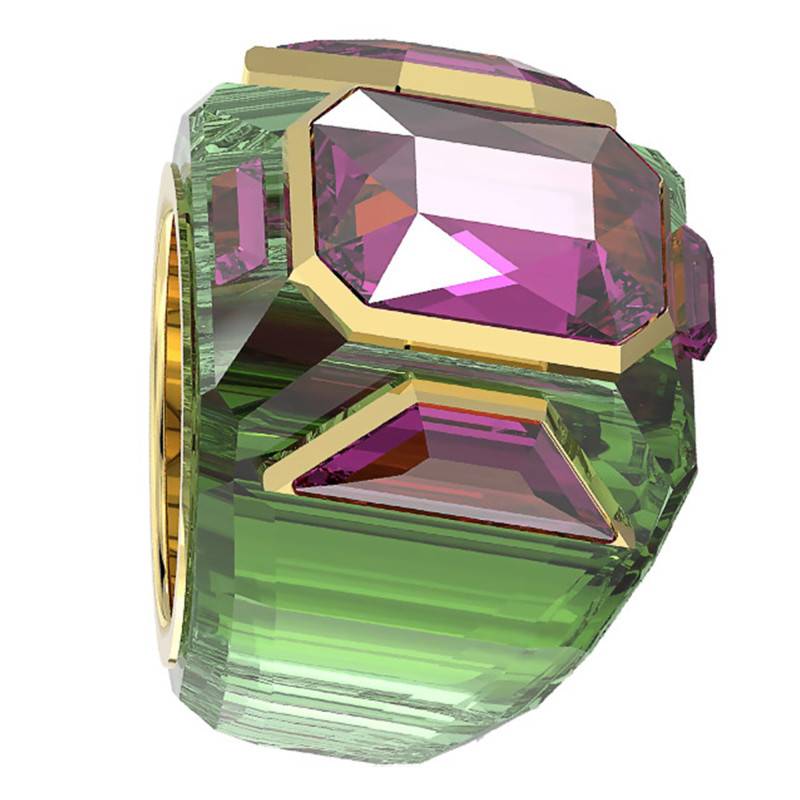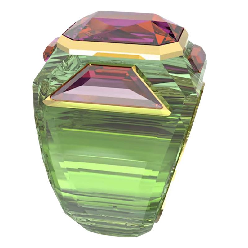Raffinée et subtile, cette sublime bague cocktail fait partie de la collection Chroma. La chevalière au design avant-gardiste présente un mélange innovant de pierres vertes et violettes sur une surface aux tons dorés. Elle explore toute la puissance du cristal et s'accordera parfaitement à vos tenues. La bague est disponible pour les tours de doigt à partir du 52.