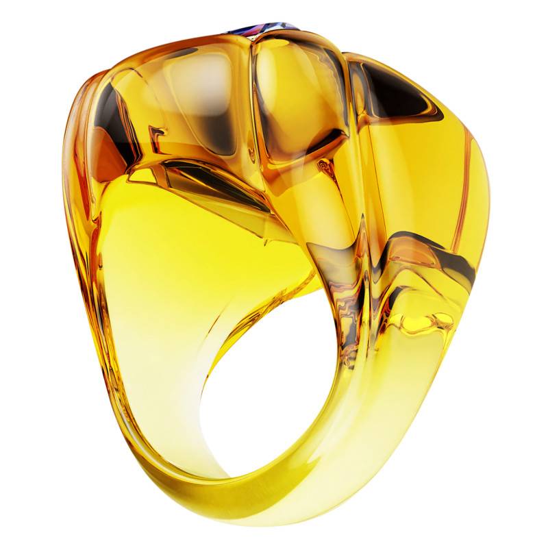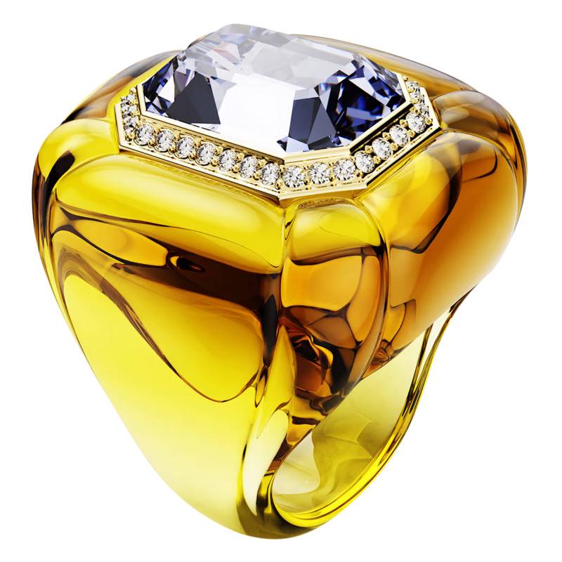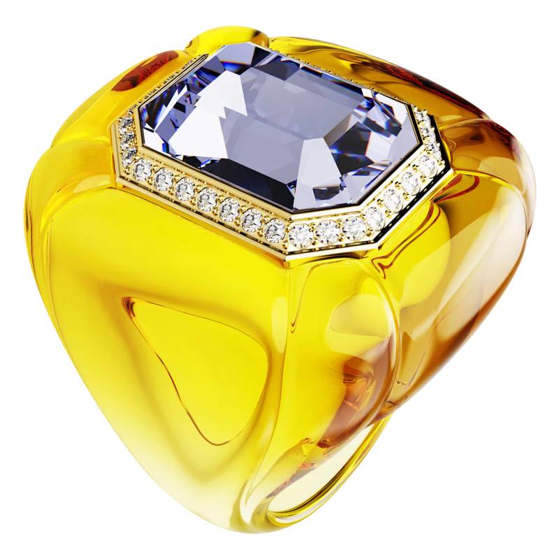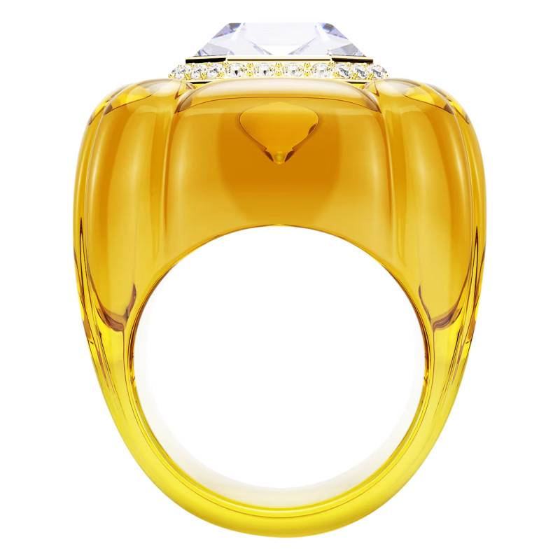 Optez pour celle belle bague cocktail de la collection Dulcis, évoquant la joie du mouvement Pop Art. Composée de résine jaune, elle vous permettra d'affirmer avec grâce votre singularité. Son anneau de couleur jaune et au design original est orné d'un cristal octogonal violet entouré d'un pavé de cristaux blancs. Ces pierres sont élevées sur une monture octogonale en métal doré, offrant un bel effet au port. Cette bague est disponible en plusieurs tailles.
