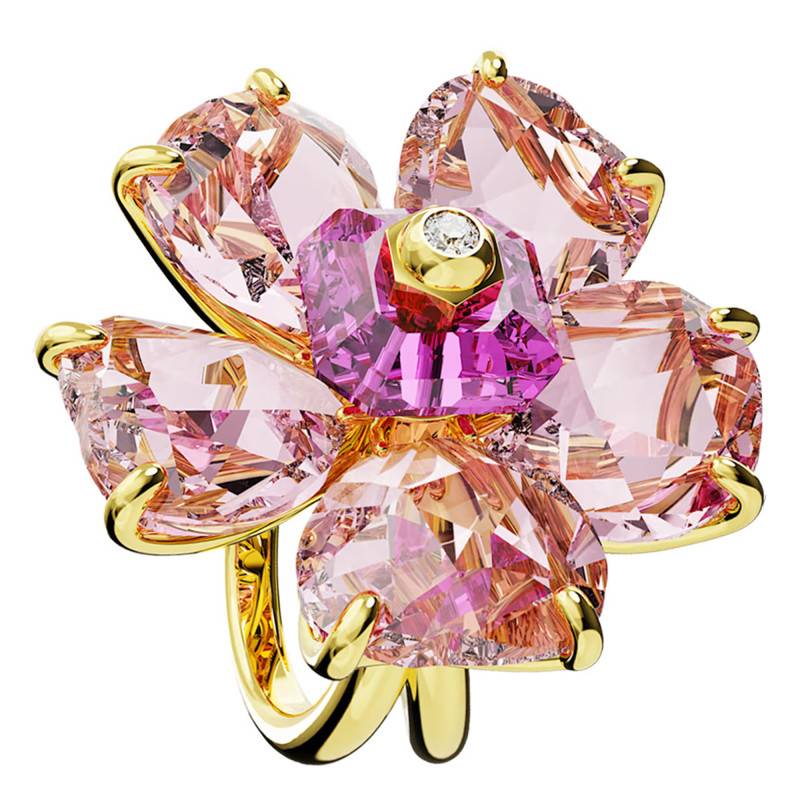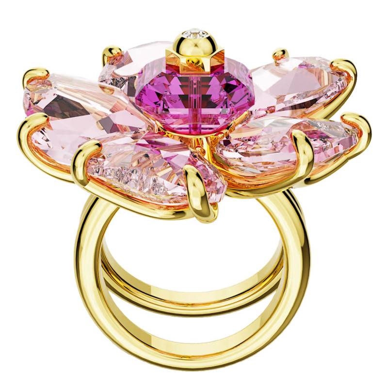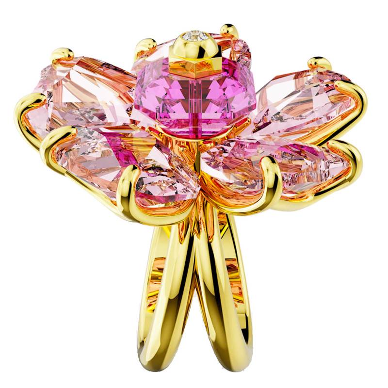 Cette somptueuse bague cocktail rejoint la série de pièces joaillières exceptionnelles et vous dévoile des cristaux roses Swarovski sertis autour d'une pierre centrale transparente. Chaque pétale de ce design floral est maintenu en place sur une monture dorée brillante qui s'unit à merveille au ton doré de la bague. Glissé à votre doigt grâce à son double anneau, elle vous illuminera par ses reflets.