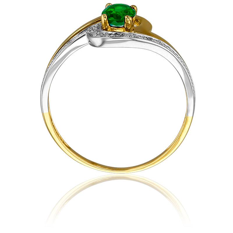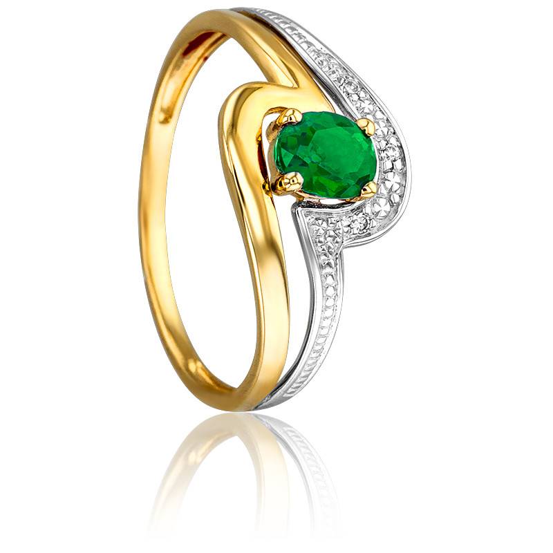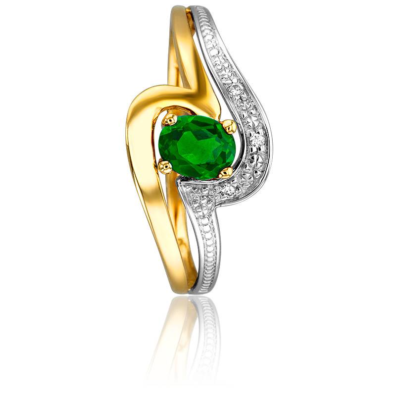 Laissez-vous charmer par cette bague deux ors composée d'une émeraude centrale de 0,33 carat, taille ovale et sertie quatre griffes. Le corps de la bague, d'une largeur de 10 mm, est composé de deux fils en arabesque : l'un est en or jaune tandis que l'autre est en or blanc pavé de diamants, agrémenté d'un léger motif perlé donnant ainsi davantage d'éclat et de lumière au bijou. Les diamants, de couleur H et de pureté P1, ont un poids total de 0,015 carat. Le poids d'or moyen est quant à lui de 1,60 gramme.