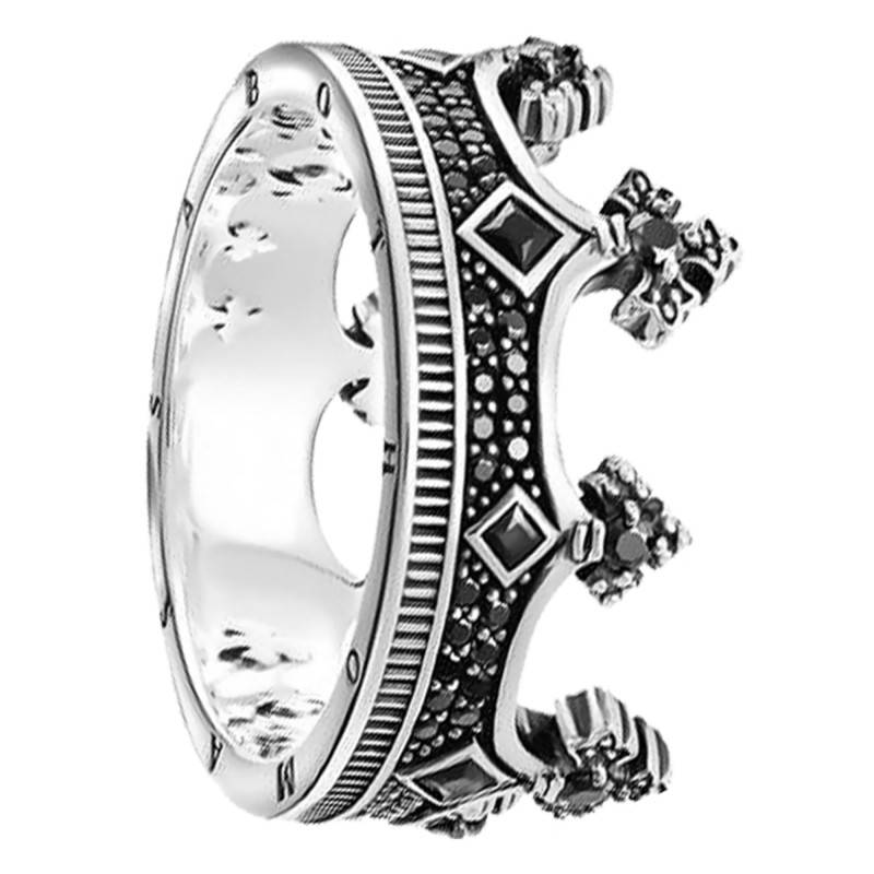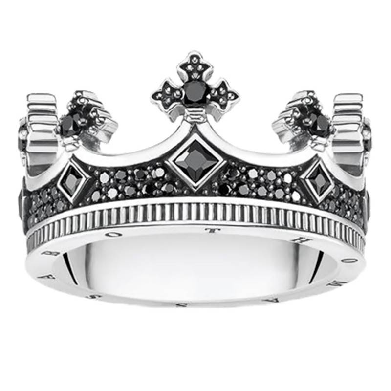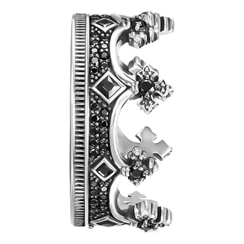 Couronnez votre main de cette bague royale de chez Thomas Sabo ! Elle est réalisée en argent massif 925/1000 et est ensuite ornée d'oxydes de zirconium noirs sur tout le long de la bague. En tout, huit gros zircons noirs sont apposés sur la bague entourée d'un pavage de zircons noirs plus petits. En forme de couronne, cette bague présente huit pics en forme de croix sur le haut de la couronne. Chaque pic est orné d'un zircon noir au centre de la croix, et sur les branches des perles d'argent pour donner de l'éclat.