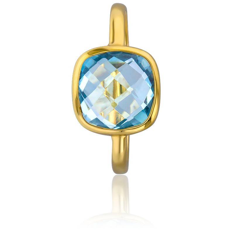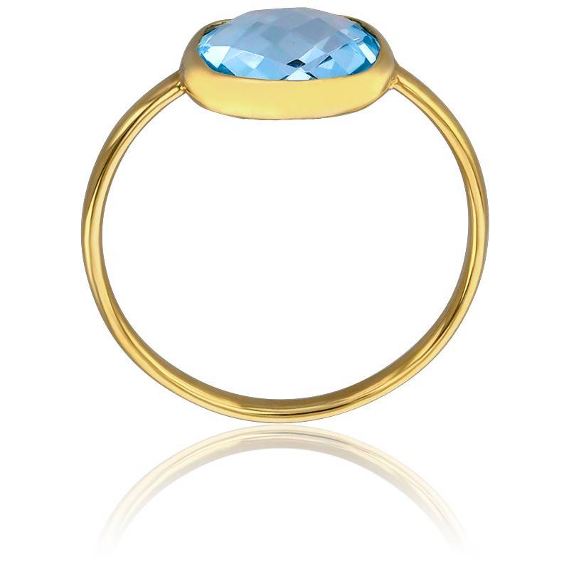 Elégante bague en or jaune 375/1000 (9K). Elle est surmontée d'une topaze bleue sertie clos, de forme coussin et taillée "briolette", c'est-à-dire facettée. Les topazes sont des gemmes naturelles, pour améliorer leur couleur, un traitement de chauffage est appliqué (ce traitement est accepté par la confédération internationale de la bijouterie-joaillerie).