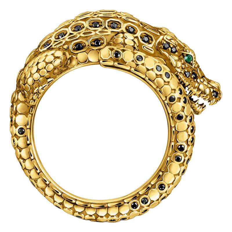 Laissez-vous envoûter par cette Bague Crocodile qui évoque puissance et mystère. Forgée en argent massif 925/1000 puis sublimée d'un plaqué or jaune 750, cette création hypnotique arbore une somptueuse finition mate. Le crocodile, symbolisant force et résilience, est magnifié par des éclats noirs et verts, gracieusement incrustés en oxyde de zirconium et gemme vitro-céramique vert. Ces pierres précieuses, nichées avec soin grâce à un serti massé et serti à grains, captivent et fascinent. La largeur de 28 mm, avec une épaisseur de 5 mm et une hauteur de 15 mm, en fait une pièce maîtresse de votre collection. Le design audacieux transcende les genres, s'adressant aussi bien aux femmes qu'aux hommes.